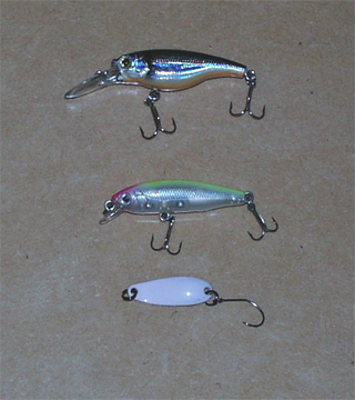 もう5月、道志川のヤマメ君も表層にいます。ドライのフライで釣れる季節です。しばらくルアーは止め!、と言うことで釣れるルアーを紹介しましょ。 上から、深層、中層、表層用って感じでしょうか!この3種類あれば、十分です。重さは3.8g、1.6g、1.2gで、1.2gのスプーンは白に見えてると思いますが、少しピンクが入ってます。スプーンは白系が良さそうですが、1.5gのおにぎり型の白のスプーンは今一、緑系もだめなようです。不規則に動くのが好いのかも? ニンフのフライは緑はOKなのですけど、なぜスプーンの緑はだめなのでしょう? 前回、桜の花びらに食いついているのを何度か見たので、買ったピンクのスプーン!5月3日は大当たりでした。 |