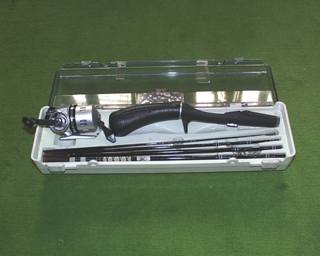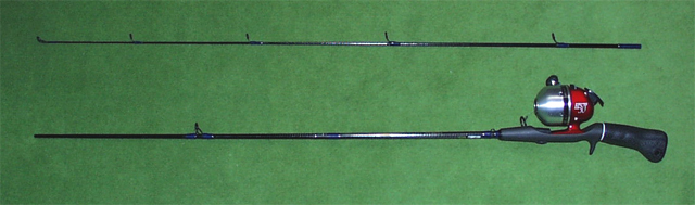 振り出しのスピニングリール用ロッドに、トリガーを付けてスピンキャスト用に改良した物 |