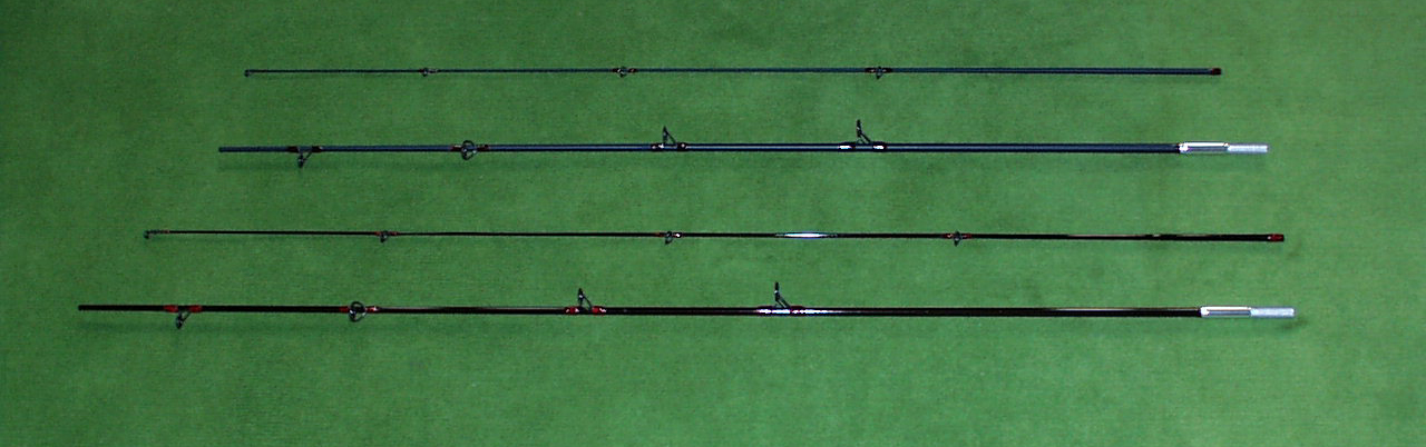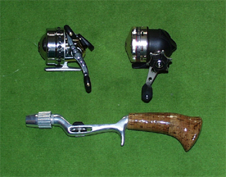 ヤマメなどの小さい魚を釣る場合、ULクラスのロッドが欲しくなりますが、スピンキャスト用のロッドはなかなか見つかりません。それなら作ってしまいましょ!って作ったロッドです。柔らかいロッドはどうしてもラインガイドを下に付けたくなるので、2pロッドの1本目で180度ひねっています。上はULクラスのファイバー、下はMLクラスのカーボンです。 新品で、手に入るリールは、限られます。お約束のジョンソンとABU。 ジョンソンはオリジナルの8lbのライン、ABUはフライリール用の下巻きラインの上に3lbのラインを付けています。 |
